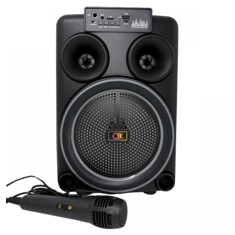 Тонколоната се доставя с жичен микрофон, което я прави подходяща за караоке партита и други събития. Компактният дизайн и вградената дръжка улесняват пренасянето й, а устойчивите материали гарантират дълготрайна употреба.