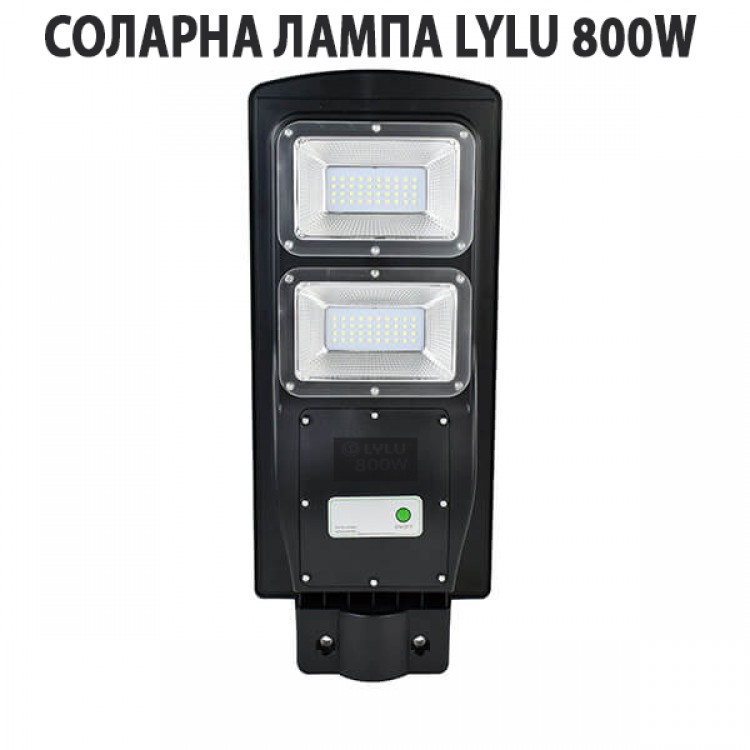 Улична соларна лампа Lylu 800W. Осветително тяло е подходящо за монтаж на височина 3-5м. и площ на осветяемост до 160кв.м.